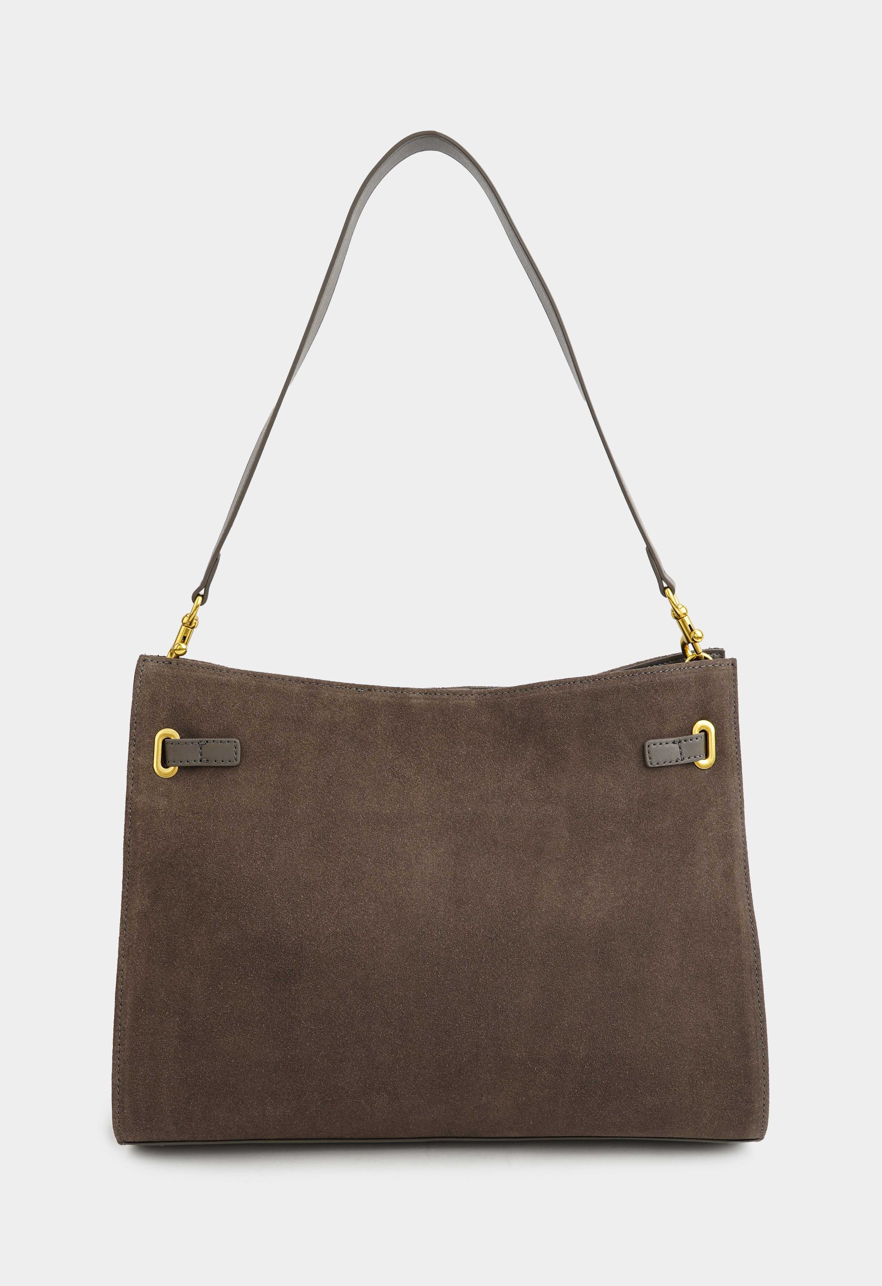 Серая сумка из натуральной замши – та самая базовая модель, которая выглядит дорого и будет служить каждый день: плечевой ремень удобно сидит на плече, а съемная ручка позволяет быстро сменить стиль носки. Золотая фурнитура и изящная пряжка придают образу элегантность, застежка на кнопке и молнии делает сумку максимально надежной. Внутри предусмотрены два отделения и два кармана, чтобы легко держать все в идеальном порядке.