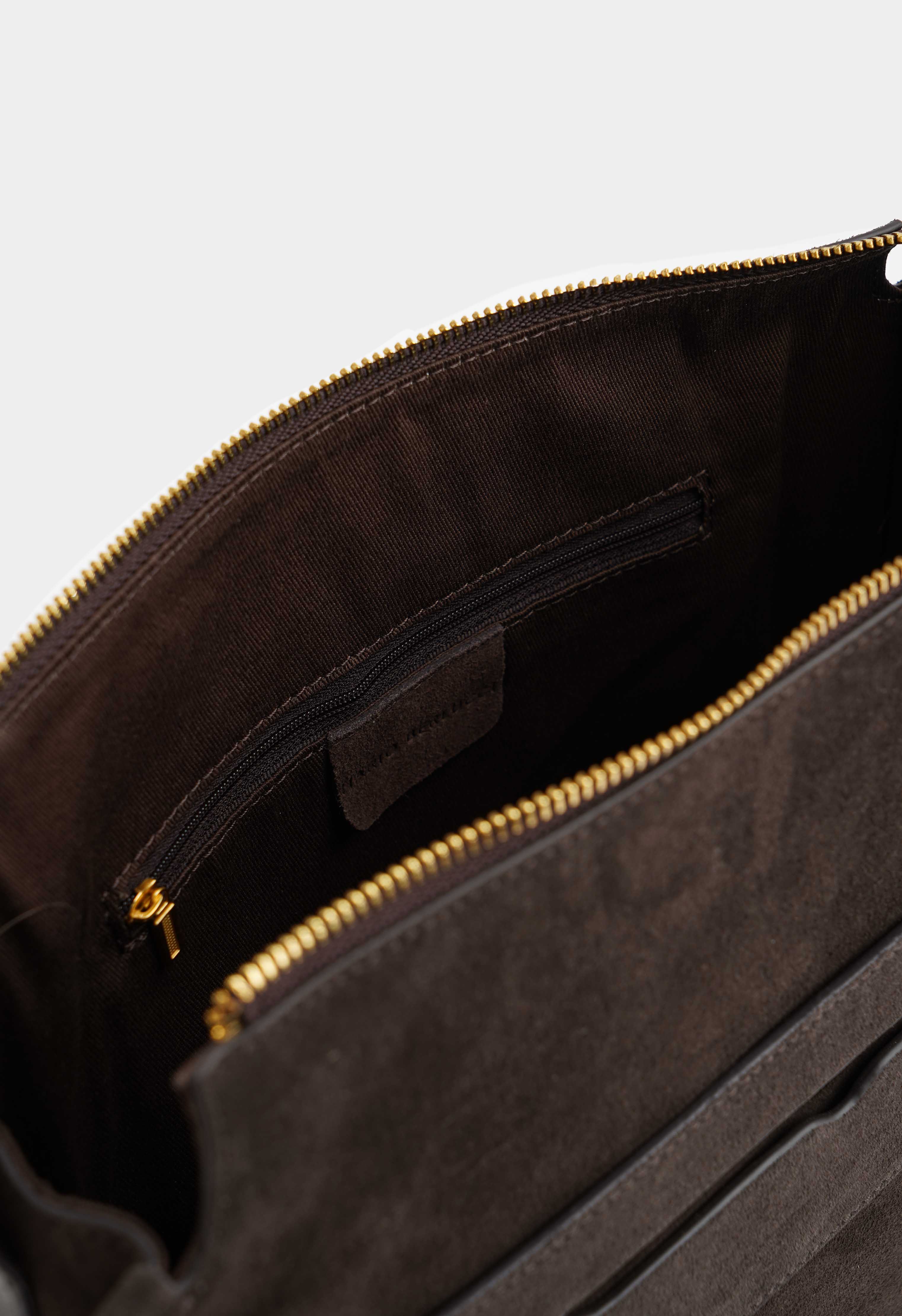 Вместительная коричневая сумка из натуральной замши – идеальный вариант на каждый день, когда нужно взять все необходимое и выглядеть стильно: плечевой ремень в комплекте обеспечивает комфорт в носке, молния надежно закрывает содержимое, а золотая фурнитура добавляет образу благородный акцент. Внутри предусмотрены два кармана, чтобы аккуратно разложить мелочи и быстро находить самое нужное.