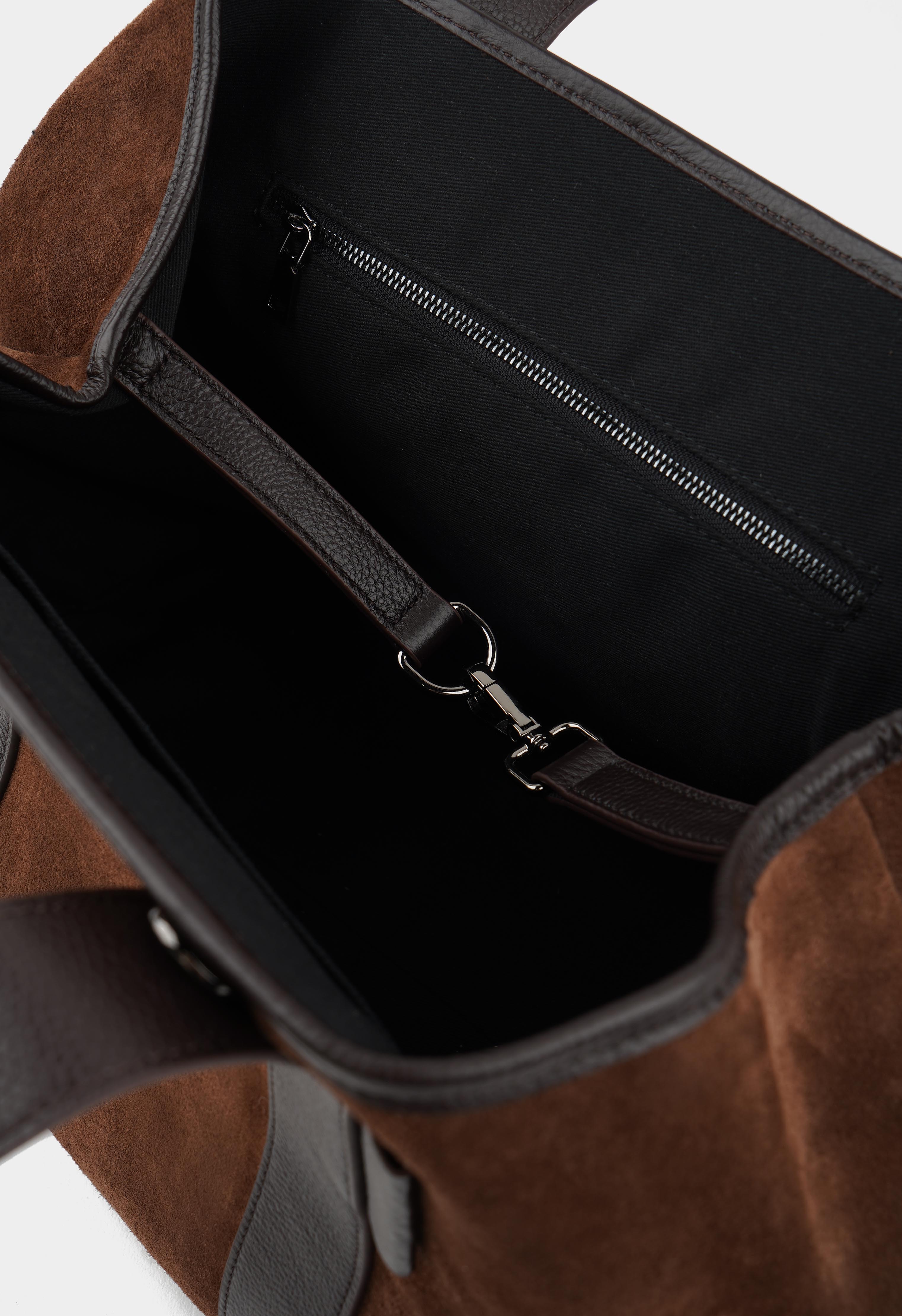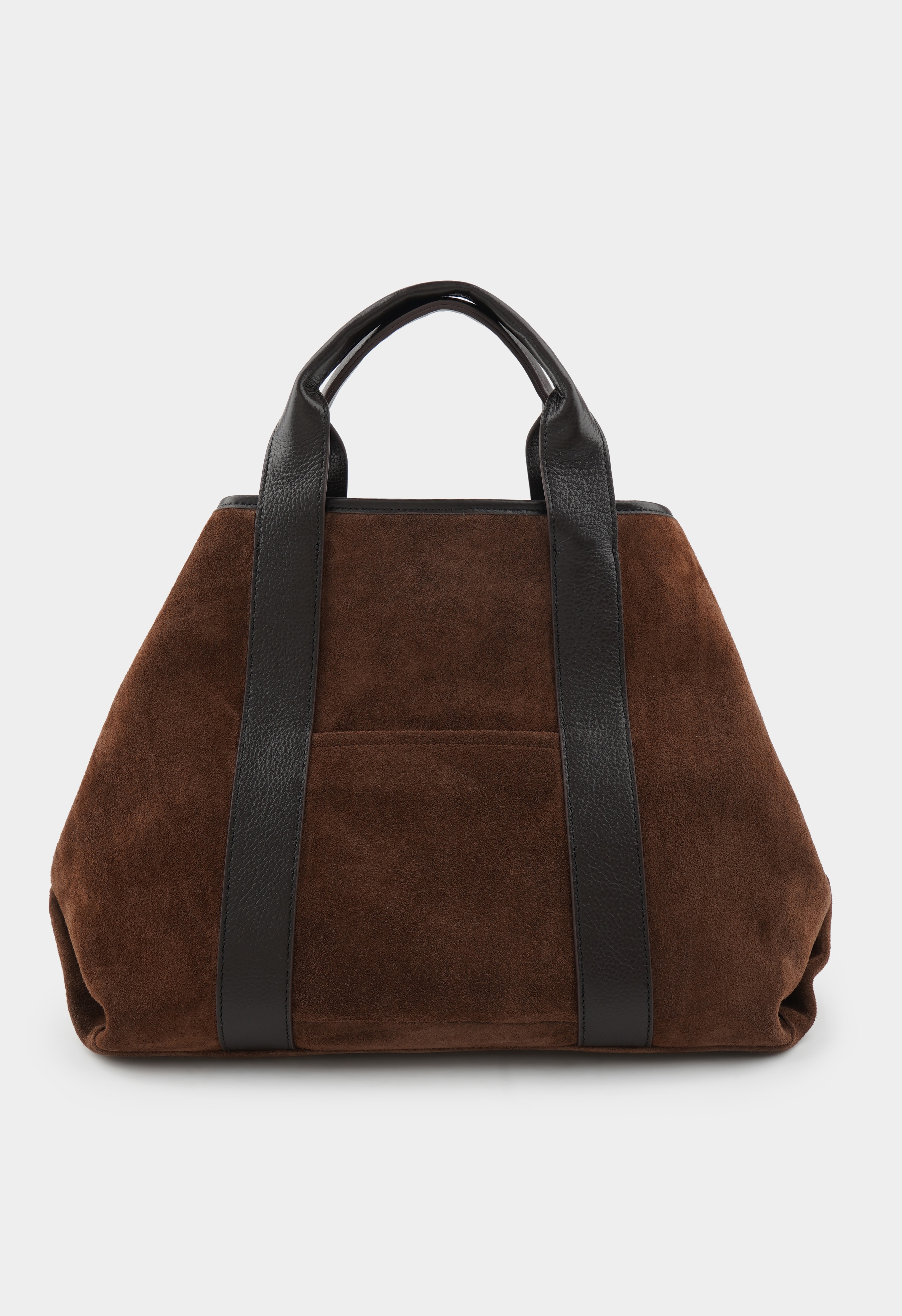 Элегантная и практичная сумка из натуральной замши в благородном коричневом оттенке с контрастными черными ручками – универсальный аксессуар, который станет вашим надежным спутником каждый день. Металлическая фурнитура придает образу современный акцент, а продуманный дизайн с двумя внутренними и одним внешним карманом позволяет держать все необходимое под рукой. Вместительный размер делает сумку идеальной для работы, шопинга или коротких поездок, в то время как съемный плечевой ремень добавляет удобства в движении. Это та модель, которая гармонично сочетается и с деловым стилем, и с повседневными образами, подчеркивая ваш вкус и уверенность.