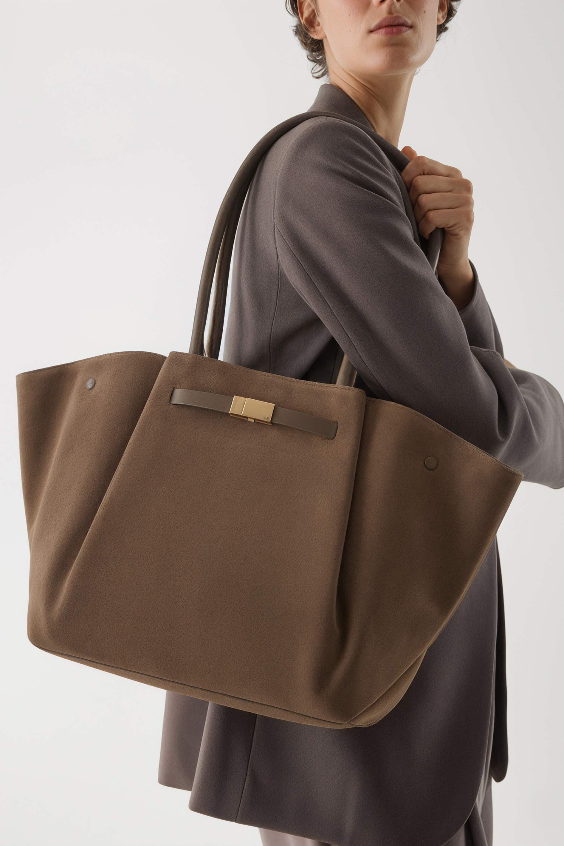 Сумка в цвете хаки из натуральной замши большого размера – практичный и стильный аксессуар на каждый день. Вместительное внутреннее отделение позволяет удобно разместить документы, косметичку и другие необходимые вещи, а два внутренних кармана помогают поддерживать порядок и быстро находить мелочи. Мягкая замша в благородном коричневом оттенке и аккуратная золотистая фурнитура создают элегантный, но при этом универсальный образ, подходящий как к повседневной одежде, так и к более строгим комплектам. Сумка закрывается на удобную кнопку и подходит для тех, кто ценит сочетание функциональности и классического дизайна.
